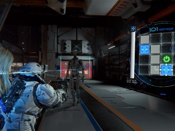 Exploration is also a team effort. Diana can utilize her Hacking abilities outside of combat to access the facility’s systems and remove environmental barriers that block progress. Meanwhile, Hugh can make use of his suit’s thrusters to traverse the lunar station’s terrain. By combining their skills and abilities, they can achieve feats that would be impossible alone.