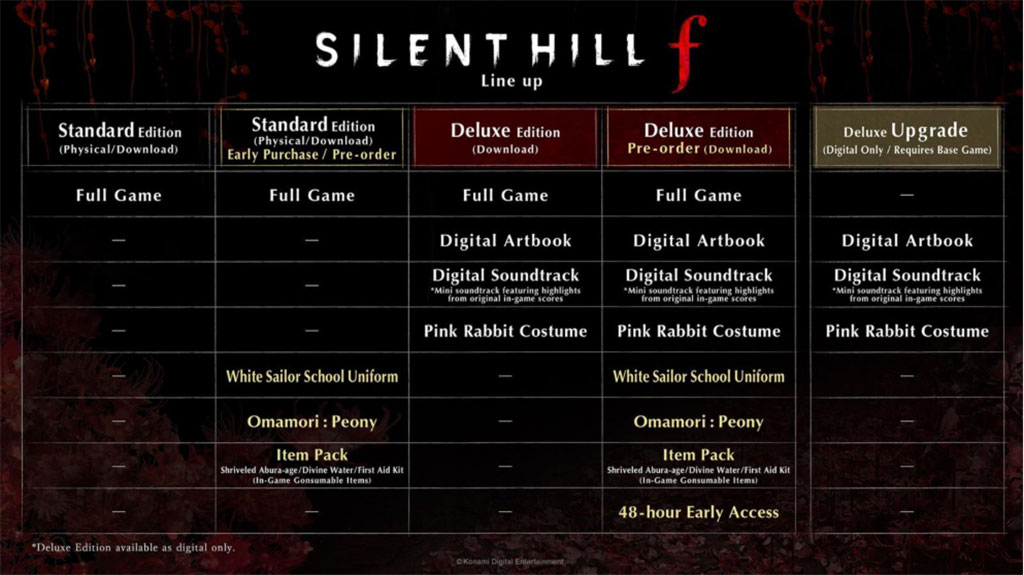 The Digital Standard and Deluxe Editions of SILENT HILL f grant unique digital bonuses including outfits, a mini soundtrack and digital artbook. The Digital Standard Edition is available to purchase, as is the physical Day One edition including the early purchase bonus items, while the Digital Deluxe Edition comes as a digital download. After launch, players can purchase the Deluxe Upgrade to enhance their game with the bonuses from the Deluxe Edition.
