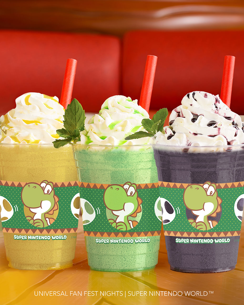 Guests can enjoy the colorful Yoshi celebration with three specially themed smoothies prepared by Chef Toad, with flavors representing the green, yellow and purple Yoshis. A special drink bottle featuring the Green Yoshi and its signature Yoshi Egg will be available for purchase.