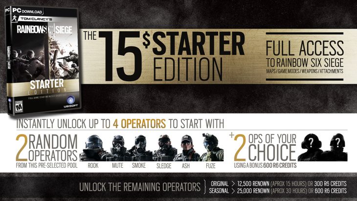 The Starter Edition is designed to give newcomers to the Rainbow Six community an alternative way to experience the full game. With the Starter Edition, new players receive access to all of the content available in Tom Clancy’s Rainbow Six Siege, including game modes, maps, weapons, level progression, features and matchmaking options, without any restriction or time limitation. The only difference from the game’s Standard Edition is how you will unlock the 20 original operators.