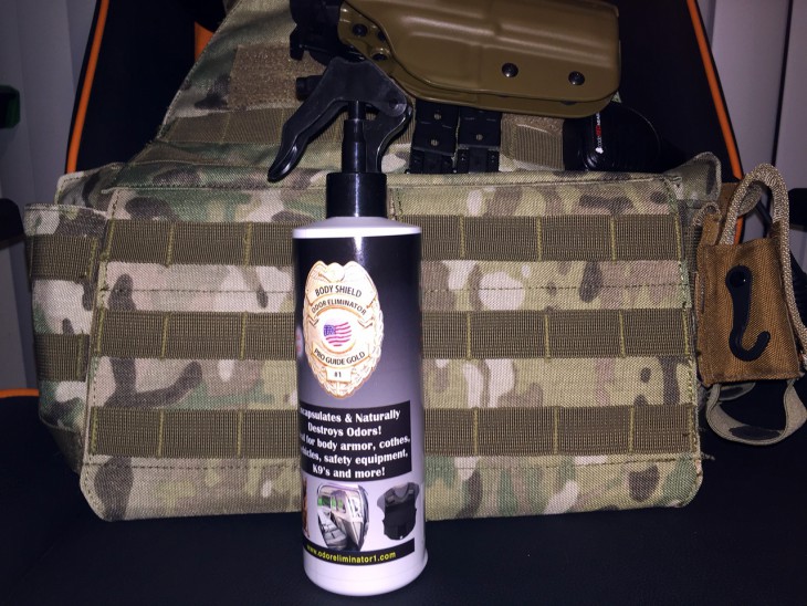 Admittedly, I wasn’t sure to believe the hype. I have been to plenty of county fairs and seen a lot of products promising fresh scents and clean surfaces. I don’t know what secret formula that Mr. Pickens and Co. have developed, but this is the real deal. The Pro Guide Gold Odor Eliminator works completely as stated. The above pictured plate carrier is what I usually take into any airsoft games we end up playing. It has seen A LOT of use in a variety of terrain – ranging from pine forests to the high desert. I never really know how the thing is supposed to be washed so, unfortunately, it got pretty stinky – especially after sitting in my trunk for a week after some very warm games with lots of sweat.