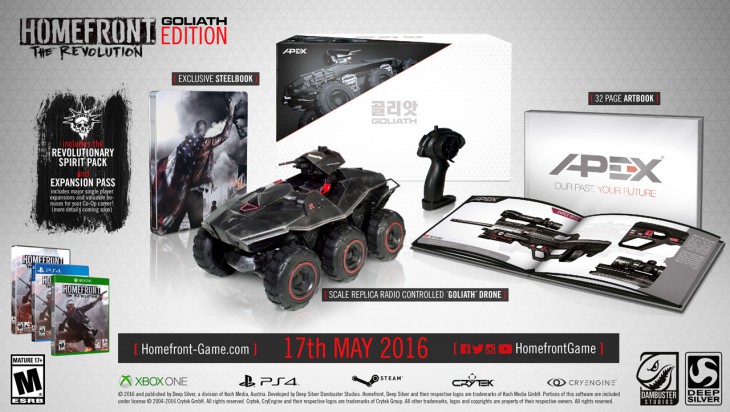 Larkspur, Calif., – March 1, 2016 – Deep Silver today unveiled the Homefront®: The Revolution Goliath Edition, a strictly limited collector edition available soon for pre-order and packed with exclusive content for fans in North America. Homefront: The Revolution, developed by UK-based Dambuster Studios, throws players into an alternate near-future dystopia where a humanitarian crisis has brought the U.S. to its knees under the brutal military control of a globally dominant Korean corporation. Surveillance drones, armored patrols and police violence have become every-day life in Philadelphia, the once proud birthplace of American independence. However, in the ruined outskirts of the city, resistance is getting stronger.