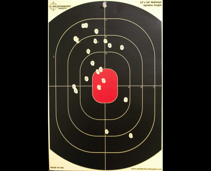 As this is the review for the stock JG BAR-10 G-Spec, my only preparation for using it was to run a barrel swab down its inner barrel to make sure it was free of debris. I highly recommend that you do this with all of your new airsoft guns – you never know what dust or particulates might be hiding there from how it was packaged up. I loaded up the rifle’s magazine with .25g BBs and setup my target paper exactly 100 feet away. For this test, I used the Splatterburst™ target paper as it readily displays where hits penetrated the paper with bright yellow coloring. I sat the rifle on a duffel bag and aligned the direction of the barrel to the target’s center with a laser.