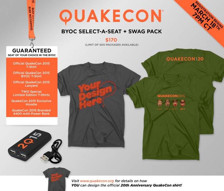March 18, 2015 — We’re pleased to announce that QuakeCon 2015 online pre-registration for the ‘BYOC Select-a-Seat + Swag Pack’ package is set to open for attendees today, March 18th at 7pm CT/8pm ET at: registration.quakecon.org. The ‘BYOC Select-a-Seat + Swag Pack’ package includes: