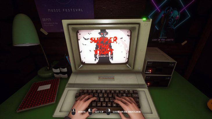 In Suffer the Night, players take on the role of Stacey Liden, a painter who specializes in horror illustrations in her isolated woods-bound cabin. After receiving an envelope containing a mysterious floppy disk, Stacy boots it up on her old Eldrixon personal computer and begins playing. As she progresses through the terror of the text-based adventure, she’s visited by a mysterious and threatening stranger, urging her to finish the game. The strange and horrifying things within the game begin leaking into the real world…will Stacey survive, or will she suffer the night? Only one thing is for certain: don’t let him get in.
