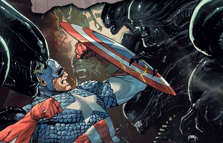 Just announced at San Diego Comic-Con’s Retailer Panel, Marvel Comics’ epic crossover sagas with the Alien franchise continues this November in ALIEN VS. CAPTAIN AMERICA by superstar writer Frank Tieri and acclaimed artist Stefano Raffaele. The four issue limited series follows Aliens Vs. Avengers, the blockbuster series by Jonathan Hickman and Esad Ribić which concluded last month and marked the first-ever crossover between both universes. Set during Captain America’s legendary World War II adventures, ALIEN VS. CAPTAIN AMERICA pits Steve Rogers against the most terrifying extraterrestrials in cinematic history after the hero’s greatest villains unleash Xenomorphs on the frontlines!
