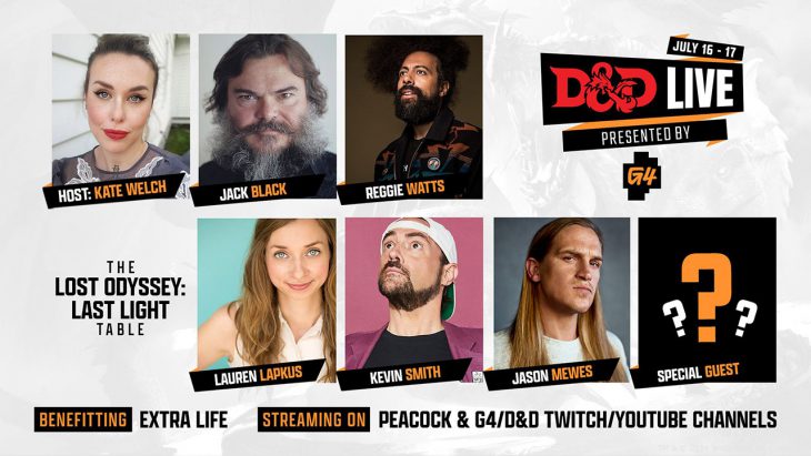 Dungeons & Dragons and G4 have assembled a studious and accomplished crew of adventurers to bring D&D Live 2021 to life on July 16 & 17. The two-day event will feature continuous entertainment designed for fans’ enjoyment including essential information on upcoming D&D storylines, Magic: The Gathering sets, and secret projects. Four two-hour D&D games will be presented and today D&D announced the lineup of one extremely consequential table G4 is dubbing Lost Odyssey: Last Light. Veteran daredevils known for perfecting the science of swashbuckling, Jack Black, Reggie Watts, Lauren Lapkus, Kevin Smith, and Jason Mewes will be led by stern Dungeon Master Kate Welch in a very serious investigation into dragons, krakens and sea giant queens. Another very special guest will be making an appearance and will be revealed closer to the event.