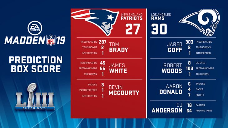 REDWOOD CITY, Calif. — Today, Electronic Arts Inc. (NASDAQ: EA) released the official EA SPORTS Madden NFL 19 Super Bowl LIII simulation, predicting a big win for the Los Angeles Rams as they walk away Super Bowl Champions and defeat the New England Patriots 30–27. Aaron Donald received the MVP award following a record-breaking Super Bowl performance in which he tallied four sacks.
