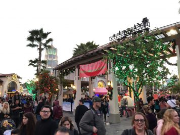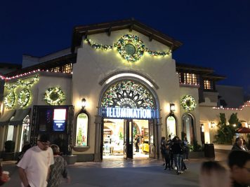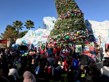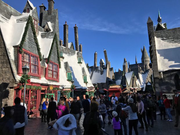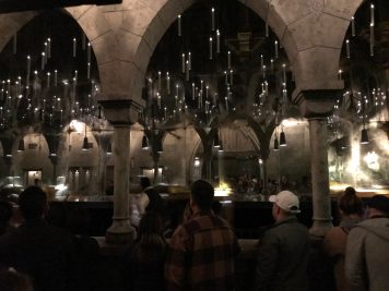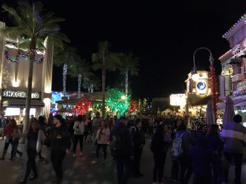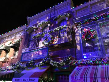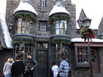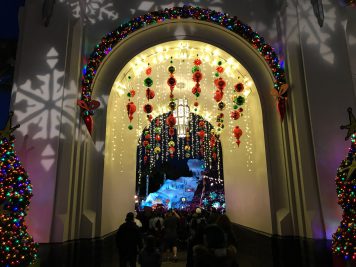 Traveling farther into the park, we entered the Christmas in the Wizarding World of Harry Potter makeover of Hogsmeade. Again, Universal Studios park designers and decorators went above and beyond, managing to perfectly balance beautiful, seasonal decor with something that seems very in-character with the fictional village. At night, you and your group can experience faux snowfall! The Three Broomsticks restaurant has a holiday plate and you can now enjoy a hot version of the popular Butterbeer beverage. The holiday frog choir also has various shows throughout the day where they sing holiday tunes sure to please. The Magic of Christmas at Hogwarts Castle is a beautiful nighttime show where precision projector work and practical effects all come together into one eye popping spectacular. Overall, The Christmas in the Wizarding World makeover is outstanding – both in design and fun factor!