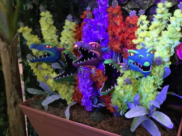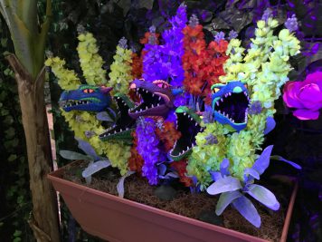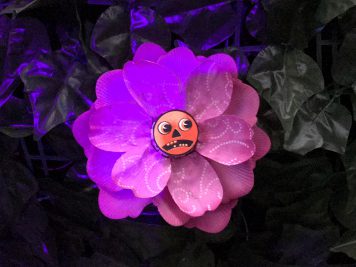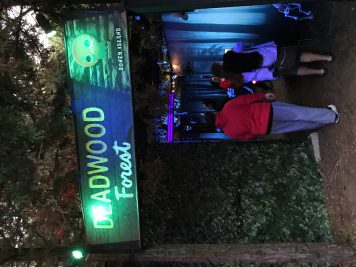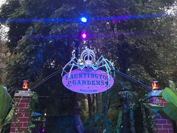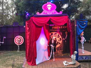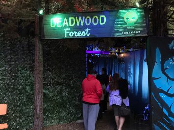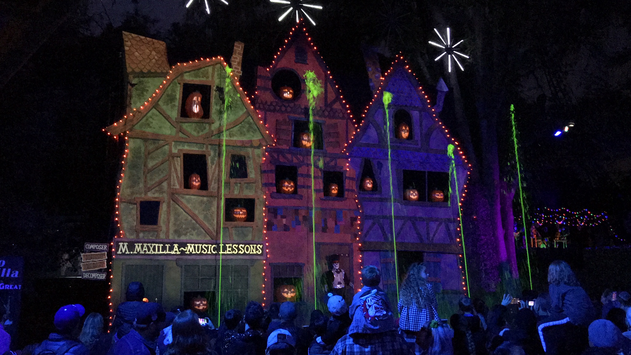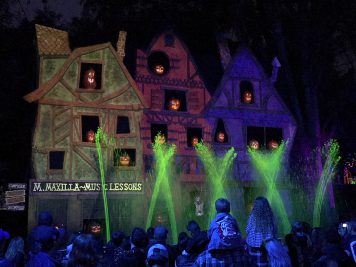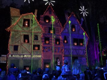 For a scant ticket price of $15 dollars a person (Children 2 and under are free), we entered the event when it opened up at 6PM and picked up a container of kettle corn and some sodas. Then we began looking at the various photo opportunities. Each photo opp has some sort of animated or interactive element and you can spend a lot of time just enjoying them. From there, we walked through the small “Deadwood Forest” maze which, while not scary, does feature a lot of cool blacklight-lit props and animated items. Finally, we watched the huge stage show at 6:45PM that featured singing pumpkins, a conjuring skeleton, and powerful glowing fountains – all moving in concert to various spooky tunes. The show is extremely impressive and, even while I was recording it through my smartphone, I could not help but smile in amazement.